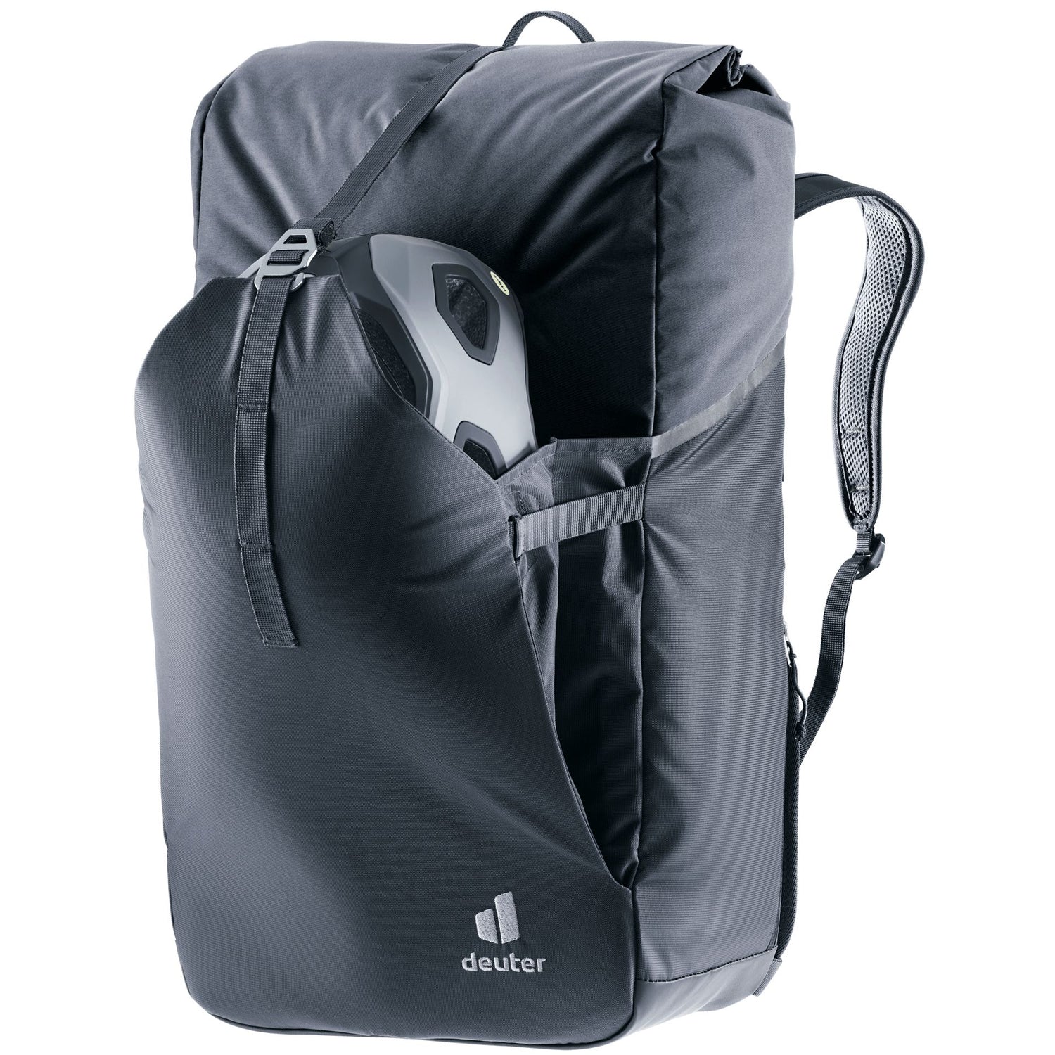 Der Deuter Xberg 25 Rucksack verwandelt sich durch die faltbare untere Hälfte des Rückenteils vom Fahrradkorb in einen Rucksack. Druckknöpfe fixieren die Platte in der oberen oder unteren Position und geben den Blick frei auf das BagFix-Schnellspannsystem (zur Befestigung am Gepäckträger) oder das Deuter Contact Rückensystem mit ergonomischen Schultergurten. Eine Roll-up-Öffnung mit Schnallenverschluss, universelle Deckelbefestigungsmöglichkeiten sowie weitere Innenfächer machen ihn praktisch und schnell zugriffsbereit.