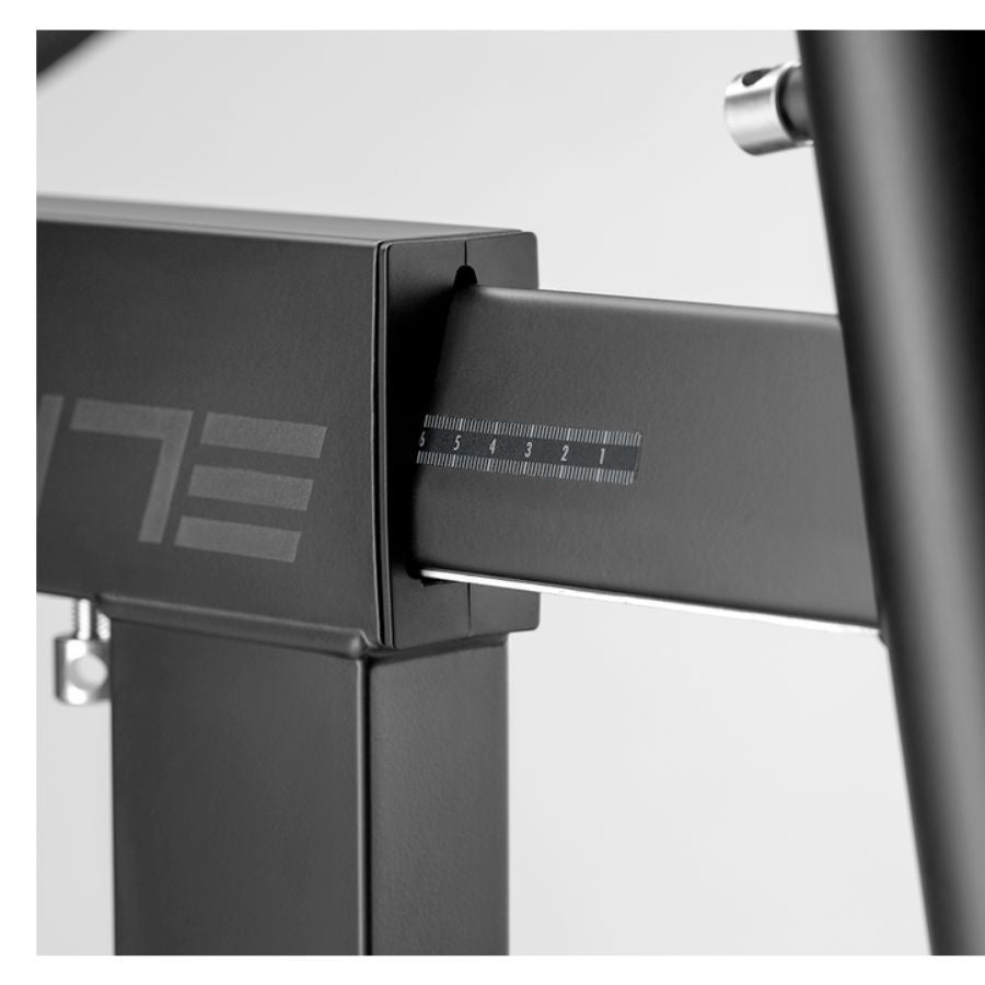 The handlebar features the same buttons and levers for shifting and braking that you would find on bikes with Shimano, SRAM, or Campagnolo gear systems, which on the Square have the same position and meaning. Each controller is equipped with 10 buttons: four keys to activate third-party app controls (protocol available pending opening by software), two buttons to directly manage the Airflow intensity if connected, or to activate virtual steering on Zwift and allow your avatar to move right or left on the route, two shifting buttons, one button for Campagnolo shifting, and one button for braking, activated with the brake lever. Combinations and pressing of levers and buttons allow additional controls such as extended shifting, switching back and forth between manual mode and simulation mode with Air, or switching from one profile to another. Thanks to its adjustable structure, Square maximizes your setup configuration allowing you to easily replicate the measurements of any bike of various sizes and heights, with different adjustable options from XS to XL. In just a few steps, you can customize Square to fit your bike by adjusting the different sections to your frame dimensions to respect your movement. of pedaling and your muscle memory when you train indoors. You will also have five different configurations available to adjust the crank length and have a complete customization of the smart frame to the specifications of your bike. Available adjustments: 165 mm, 167.5 mm, 170 mm, 172.5 mm, 175 mm. With Square, silence becomes the key to an extraordinary training experience. Thanks to the belt drive system, you can enjoy a smooth and silent pedal stroke like never before without any noise coming from the chain or roller. This system is the ideal integration for your training area because it offers you a uniform and realistic pedaling experience, with the benefit of absolute silence and always clean operations, because the belt does not require lubrication and does not get dirty like the chains of conventional frames. Thanks to the complete absence of noise and vibrations, Square is perfectly suitable for home use, without disturbing family members or neighbors. The frame is Plug&Play because it is battery-powered and does not require electricity when you use it, allowing you to focus only on assembling the Square with the roller and any accessories. Elite's Smart Frame offers you the versatility to be used in stand-alone mode even when not connected to a specific training app. Ideal if you use it in an area with poor connection. Simply using the levers on the handlebar, you can adjust the resistance from 1 to 16 levels, regardless of the lever operated, to have total control over your training even without any type of connectivity.
