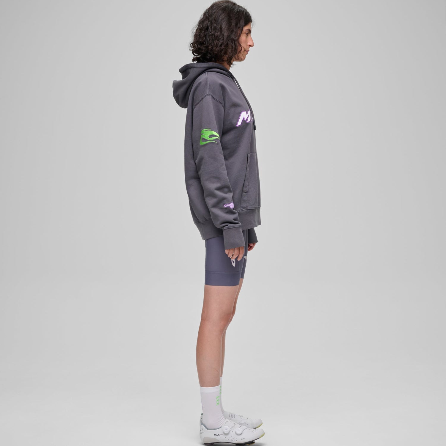 The front pockets with cotton ripstop lining ensure durability and practicality, while the side zip pocket at the lower back provides secure space for small items. The reflective logos add a technical touch to this MAAP WorldTour Hoodie, making it a premium cycling sweatshirt with a clean, functional design.