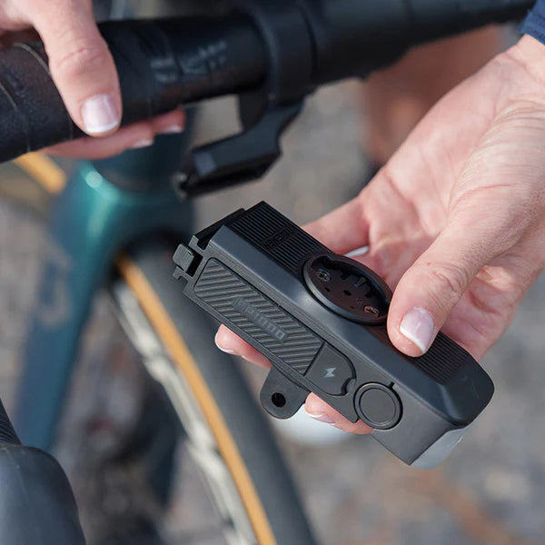 With 1000 lumens of powerful night illumination and improved daytime visibility, the Ravmen FR1000 light guarantees your safety 24 hours a day. Its dual-function design combines a front light with a bike computer mount, saving space and adding versatility. Equipped with automatic on/off, a convenient quick-release system, and up to 39 hours of battery life, it is designed to accompany you safely on every ride. Integrated mount for bike light and computer in a single product; it saves space and illuminates the display. Compatible with default Garmin mounts, with additional adapters for Wahoo and Bryton included. The headlight angle can be freely adjusted from 0 to 30° to suit your riding style and preferences. The quick-release design makes charging and handling more convenient. Large 3000 mAh battery capable of providing emergency charging for bike computers. The FR1000 automatically turns off after 2 minutes of inactivity and automatically turns back on when it detects vibration. Aluminum alloy heat dissipation design (the detailed image highlights the airflow grooves).