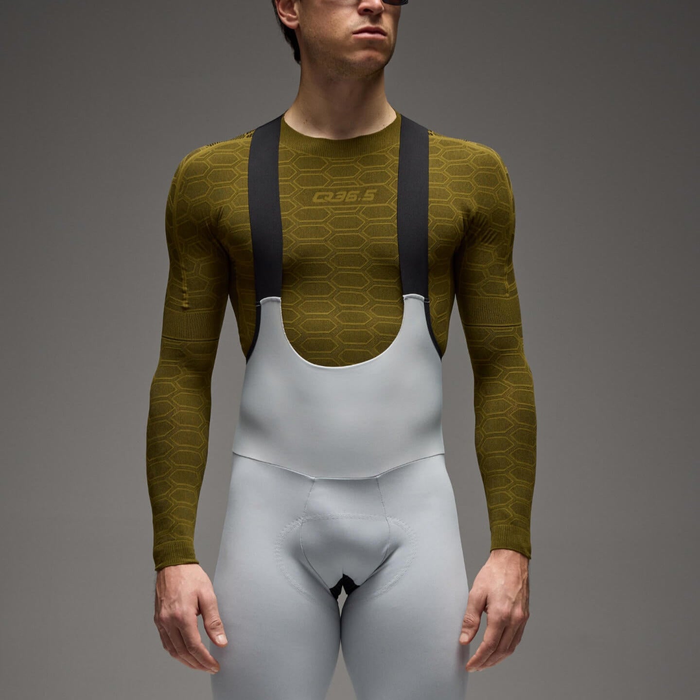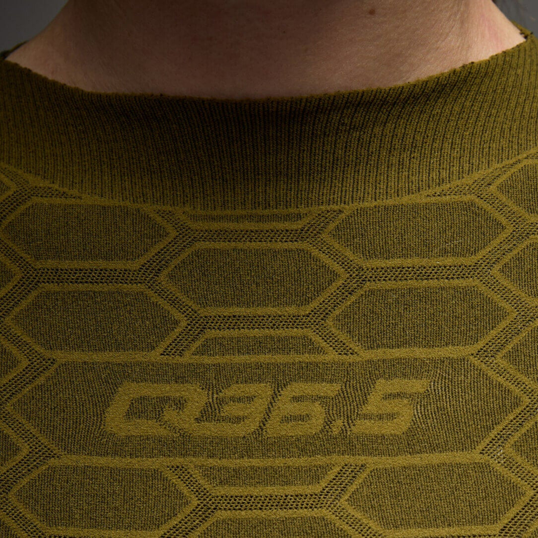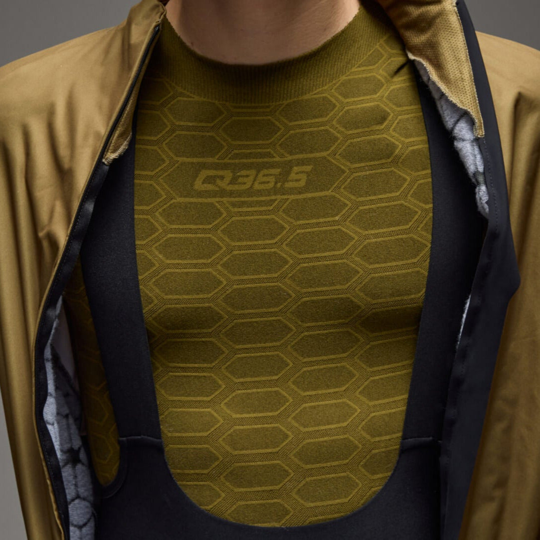 Exploiting the cutting-edge possibilities of Karl Mayer textile machines, Q36.5 has developed an extreme technological vision of traditional seamless underwear. Even cyclists who are already familiar with the most advanced models of seamless base layers will notice the new sensations that this product can provide. And above all, far superior elasticity and less resistance to movement in all directions, thanks to the ability of Karl Mayer machines to build multiple tubes without any seams (most 'sleeveless' underwear still requires edging around the armhole due to technological construction limits). Clearly, the elimination of all seams (except for two joining points on the shoulders) significantly increases the comfort of a tight-fitting garment, such as the Jersey base layer. Lightweight material that is much more durable and less fragile, thanks to the fact that, unlike other textile machines, Karl Mayer machines can create a snag-free garment. The Jersey base layer is cut raw, thus all seams and hems are eliminated from the garment. Therefore, it is also possible to cut and modify the garment according to the user's wishes without compromising the product's durability and without the risk of the fabric fraying. The honeycomb structure of the Jersey is offered in various densities, combined with some more or less open mesh sections, taking into account the thermal requirements and sweating zones of the athlete's body. This not only improves comfort and protection but also significantly reduces the volume of the product. The result is an extraordinarily pure and minimalist Jersey base layer.
