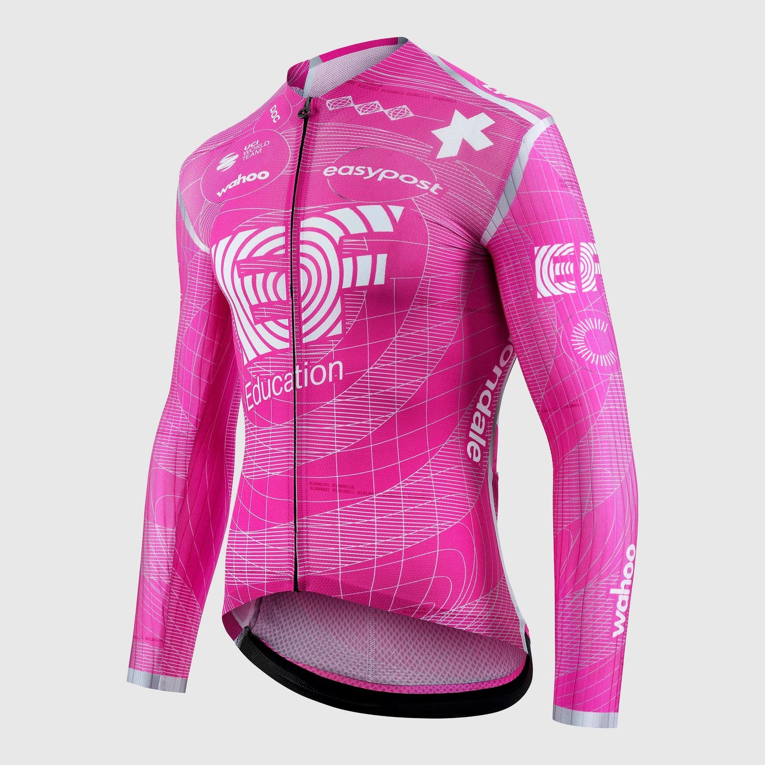 Jersey long sleeves Assos EF Education EasyPost 2026 Equipe RS S11 race jersey developed for the WorldTour, featuring the updated graphics of the EF Pro Cycling team, is designed with long sleeves to simulate a skinsuit and offer complete aerodynamics in summer races as well as light protection in temperate spring and autumn weather conditions. The RS S11 is a Jersey proven at the highest levels of competition, as demonstrated by the EF Pro Cycling team. The graphic, called WE RIDE IN PEACE, is enhanced by silver stitching and numerical details reminiscent of the first space suits. In addition to the team logo, the RS JS Jersey S11 retains all its features, including skinsuit-level aerodynamics and long sleeves made of 550CX fabric. The material channels airflow to reduce drag, and the texture is oriented to maximize aerodynamic gains in more aggressive riding positions. The main fabric, miniCheck Tex, is the same used for the previous model and ensures ultra-lightweight and highly breathable comfort, as well as a snug and compressive fit, while the PILtec Plug-In technology, which combines an ultra-lightweight strip of fabric with silicone micro-grippers, anchors the Jersey at the back and stabilizes it during out-of-saddle efforts, sprints, and corners, even when the fabric is damp or wet.