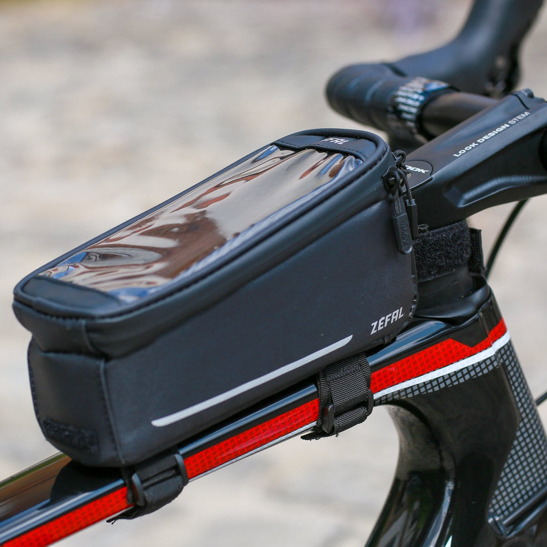 The Zefal Console Pack T1 2 in 1 phone holder bag is a frame bag with an integrated smartphone holder. It is an essential accessory for carrying the phone and small items such as repair kits, CO2 cartridges, energy gels, and keys. An optional double strap makes it easily adaptable to wider frames as well. The touch screen can be used to view and record race data. A cover is included for optimal protection in case of rain.
