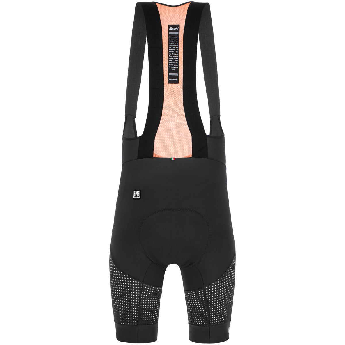 Santini Freccia bib shorts, extra breathable with Sensitive mesh side panels for greater ventilation and soft and light Delta Polartec® braces for quick drying and great breathability. NAT chamois with a cooling effect. Ideal for extremely hot rides and indoor cycling.