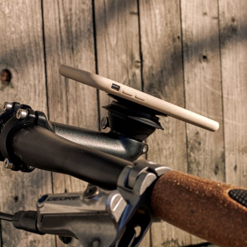 The Fidlock cell phone holder fidlock cap base for smartphones consists of a special ahead cap that is screwed onto the steering tube. The base is then positioned on the cap and is easily secured with a clamp using a knurled or anti-theft screw with an Allen screw. The base of the ahead cap can then be quickly removed when a smartphone is not needed, while the simple cap remains screwed onto the bike.The magnetic counterpart is located on the smartphone. Either in the form of a special VACUUM cell phone case or the universal VACUUM adhesive patch for your existing cell phone case. The connecting piece simplifies attaching the smartphone to the holder and reliably keeps it on the windshield. The magnetic force centers the smartphone on the holder, so the suction force of the vacuum is always guaranteed, as the mobile device cannot slip. As soon as forces act that exceed the attraction force of the magnets, the grip is further secured by the suction cup, which creates a vacuum. The smartphone is released simply by pressing a lever on the side of the holder. Thanks to the ingeniously intuitive combination of magnetic force and negative pressure, the smartphone can be used with one hand and rotated 360°, while a ball joint prevents rotation during travel.
