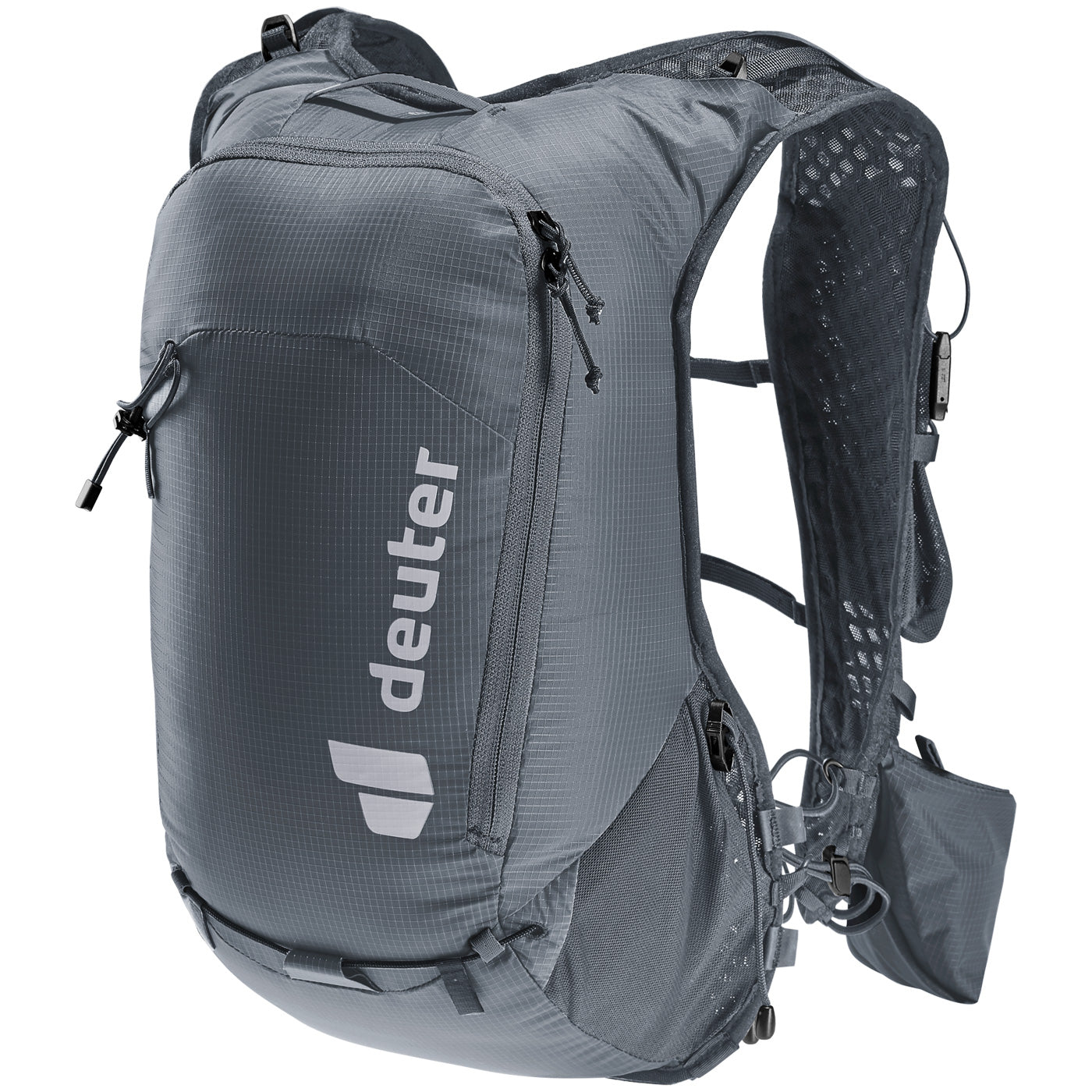 Light and comfortable Deuter Ascender 7 backpack: The ergonomic shoulder straps in the shape of a vest with elastic compression strap, the adjustable chest straps and the soft material of the back allow the backpack to adapt to the upper body. In addition, the internal mesh pocket and side compression straps minimize the up and down movement of the load while running. The holstered post holder on the shoulder strap allows quick access to the posts. Soft hip flask and GPS are also always close at hand in the shoulder strap pockets. The main material of the Trailrunnig backpack is 100% recycled and bluesign® certified.