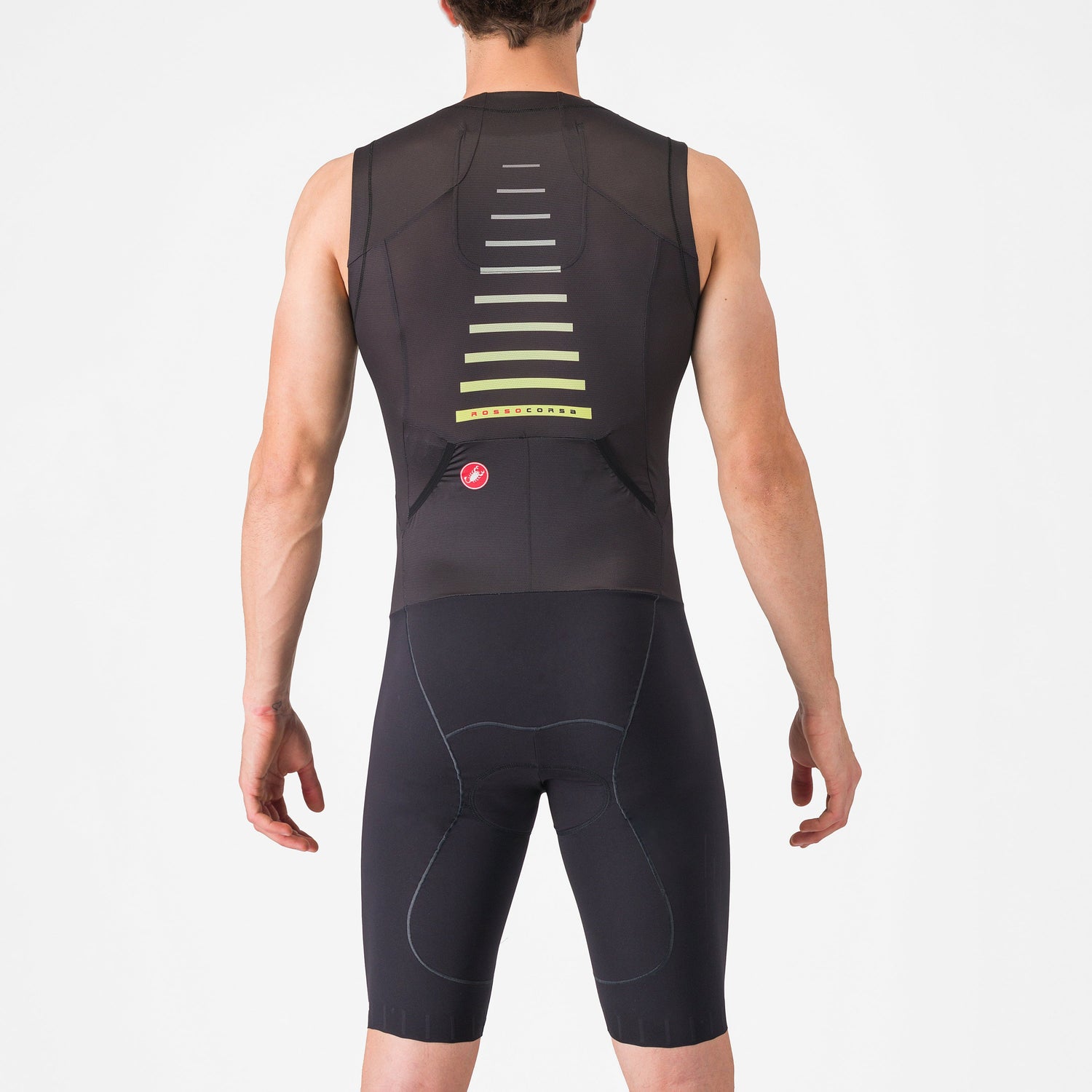 - La apertura frontal Sanremo de Castelli simplifica la flexión para el ciclismo y la relajación para la carrera y la natación, permitiendo también pausas más fáciles en la naturaleza o la apertura para carreras muy calurosas.