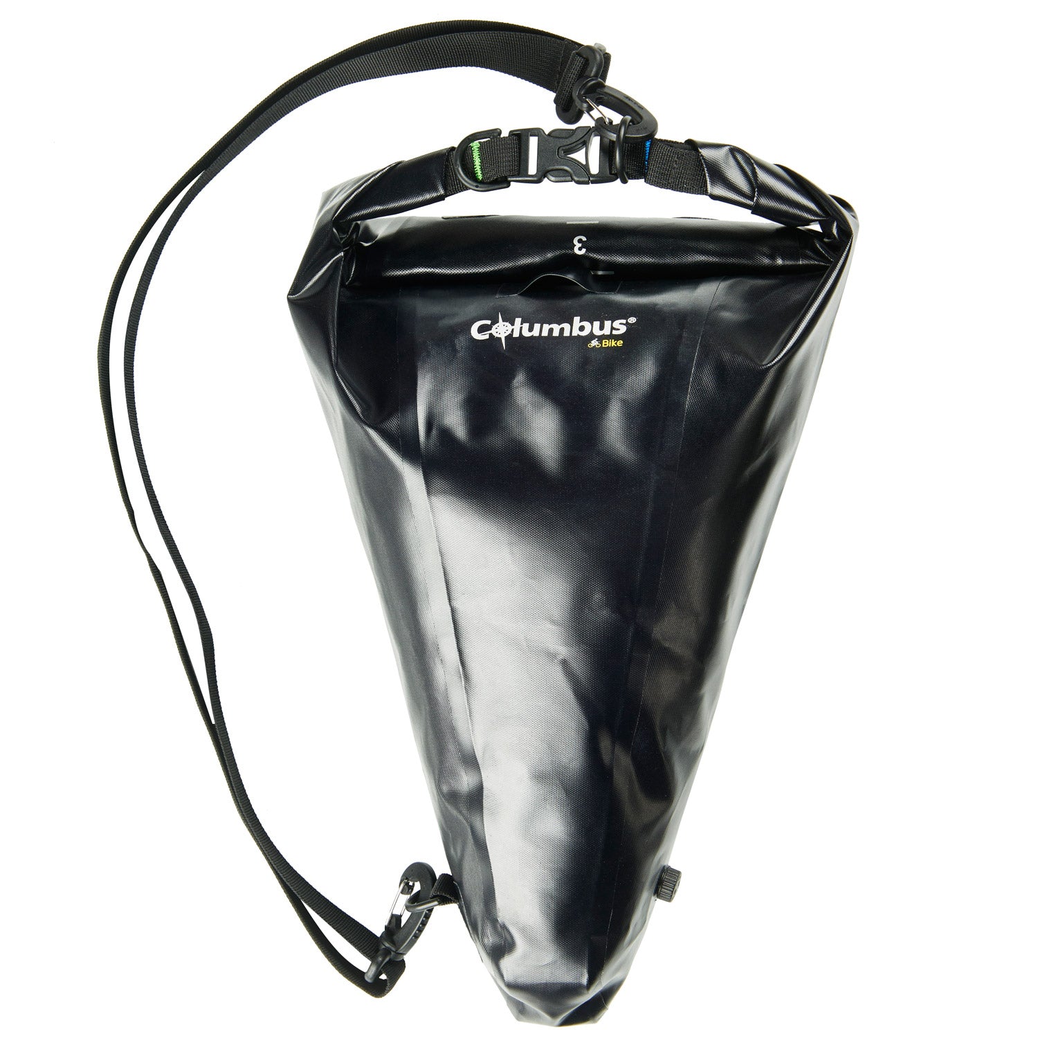 Bolsa de sillín Columbus Dry, impermeable para fijar al sillín de la bicicleta. Ligera y con capacidad ajustable hasta 8 l gracias al cierre enrollable y a las correas de compresión. El arnés de fijación está anclado al tubo del sillín mediante un largo velcro y al sillín mediante 2 correas ajustables con hebillas. En la parte superior hay una banda elástica que ofrece espacio adicional de contención. Una vez colocado el arnés de fijación, la bolsa se puede fijar y quitar fácilmente. La bolsa impermeable se puede llevar al hombro gracias a la correa desmontable. Detalles reflectantes y puntos de fijación para luz trasera.