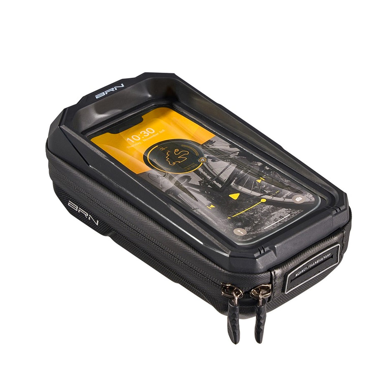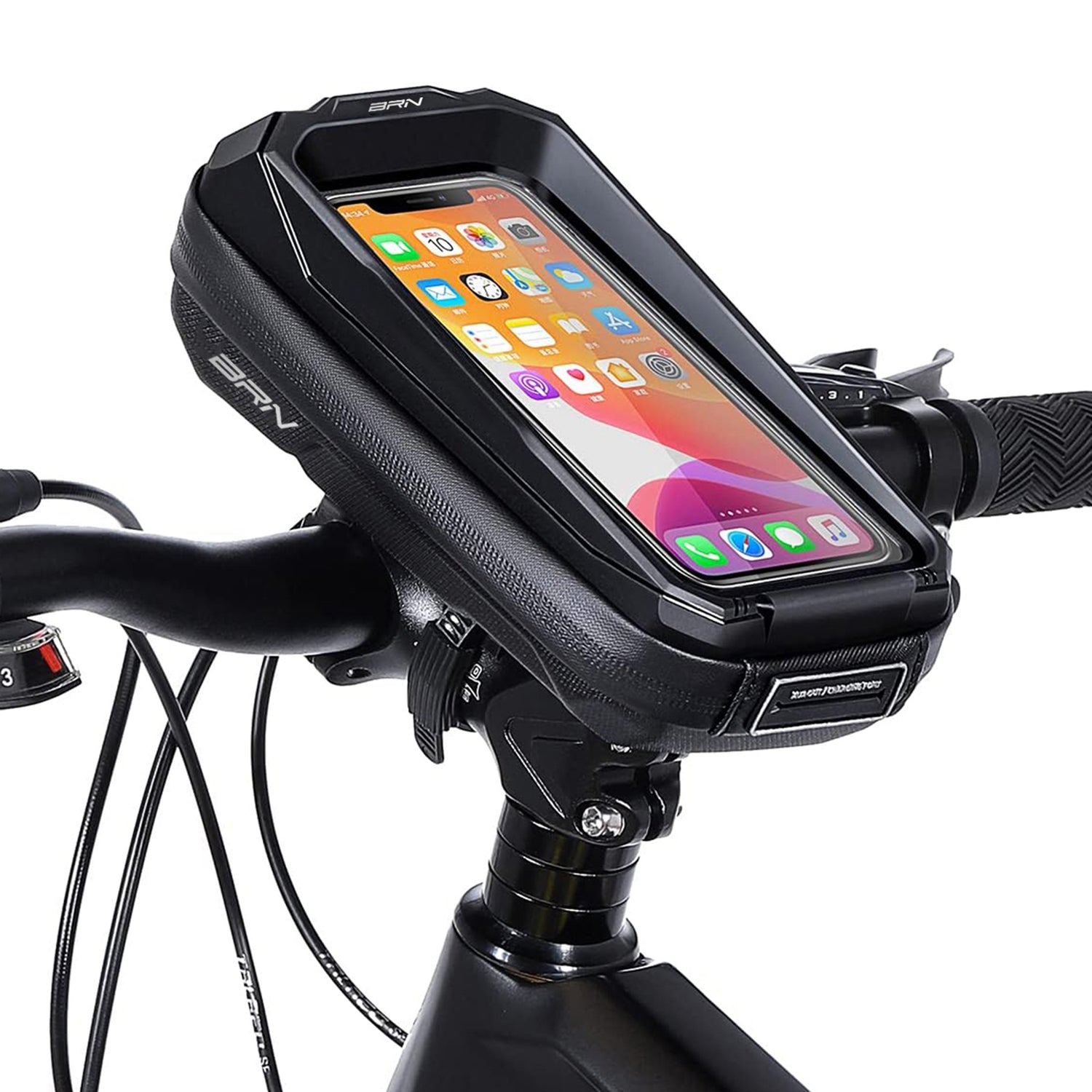 Bolsa BRN Hard-Shell Tank Visor talla S. Resistente bolsa porta celular con pantalla táctil de color negro, impermeable, con liberación rápida al manillar y capacidad de 0,6 l. Los logotipos presentes en la bolsa son todos reflectantes para aumentar la visibilidad durante las horas en las que la luz solar es menos intensa.