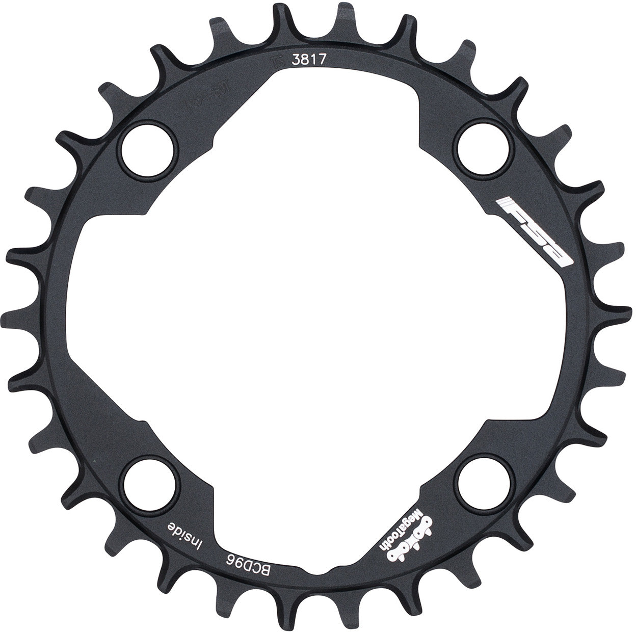 Corona FSA Pro Single CR SB BCD96. Anodizada negra con detalles plateados CNC y logotipos grabados a láser.