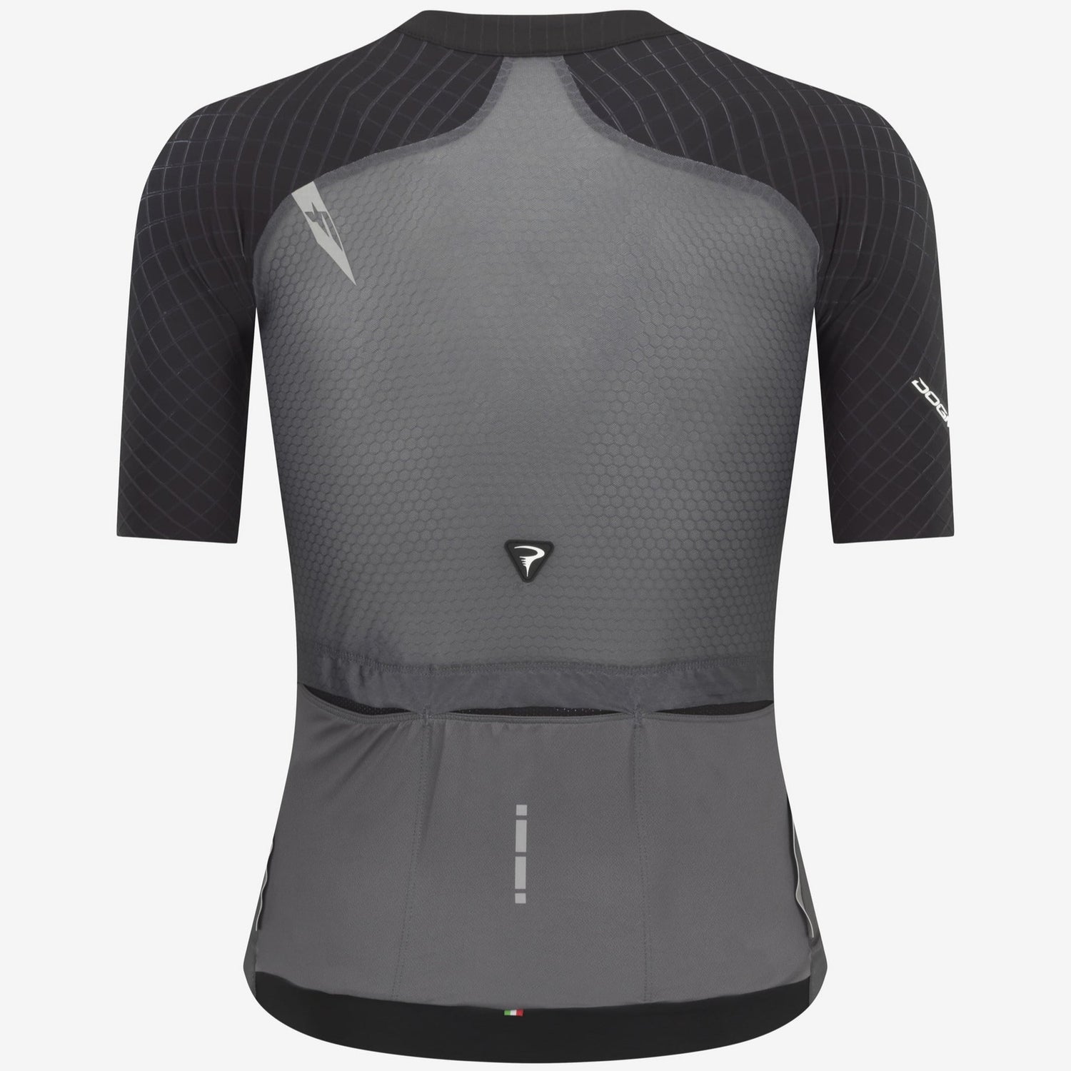 - La construcción de la manga raglán, constituida por un solo panel, se extiende hasta el cuello maximizando las características aerodinámicas del tejido drag zero. Gracias a la característica línea de costura diagonal resulta más ergonómica y funcional.