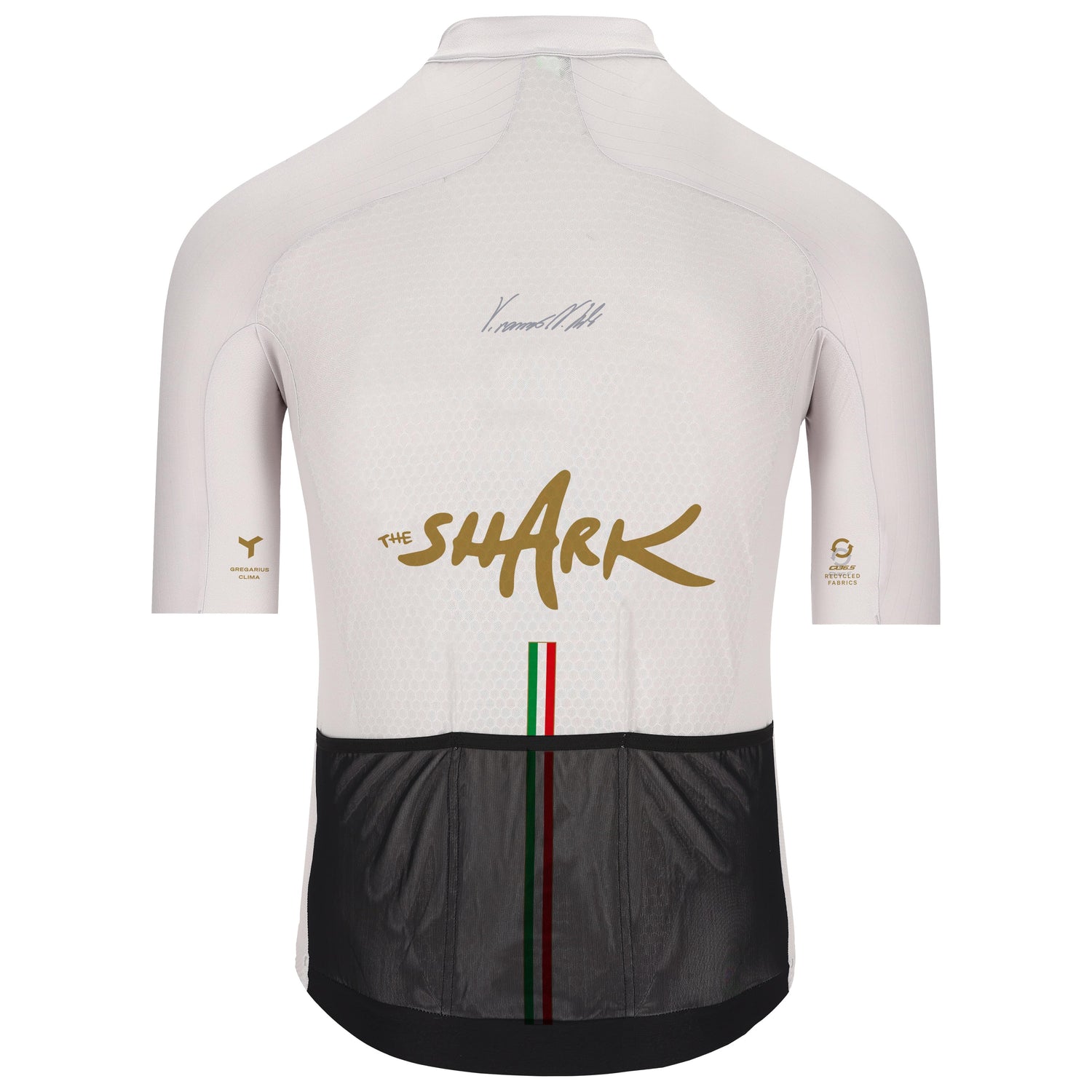 La camiseta de hombre Q36.5 Gregarius Clima Nibali Olympic, realizada con un innovador tejido de malla en red propietario, se caracteriza por una estructura 3D ultra-delgada en la parte superior del cuerpo para optimizar la ventilación y el transporte de la humedad. Ligera y suave al tacto, su estructura en panal, empleada en los paneles traseros, favorece un efecto push-pull que previene la acumulación de sudor, empujándolo hacia el exterior, donde puede evaporarse rápidamente. Las mangas raglán están hechas con el mismo tejido aerodinámico de canalé de la camiseta Gregarius Pro. El diseño ultraligero se completa con bolsillos traseros de malla, un detalle exclusivo de este modelo. El diseño limpio y lineal se caracteriza por elementos gráficos dorados sobre un fondo blanco y detalles gráficos tricolores para celebrar la unidad internacional del deporte promovida por el movimiento olímpico, rindiendo homenaje a Italia, el país de Nibali, que ha representado con orgullo más veces durante su carrera profesional.