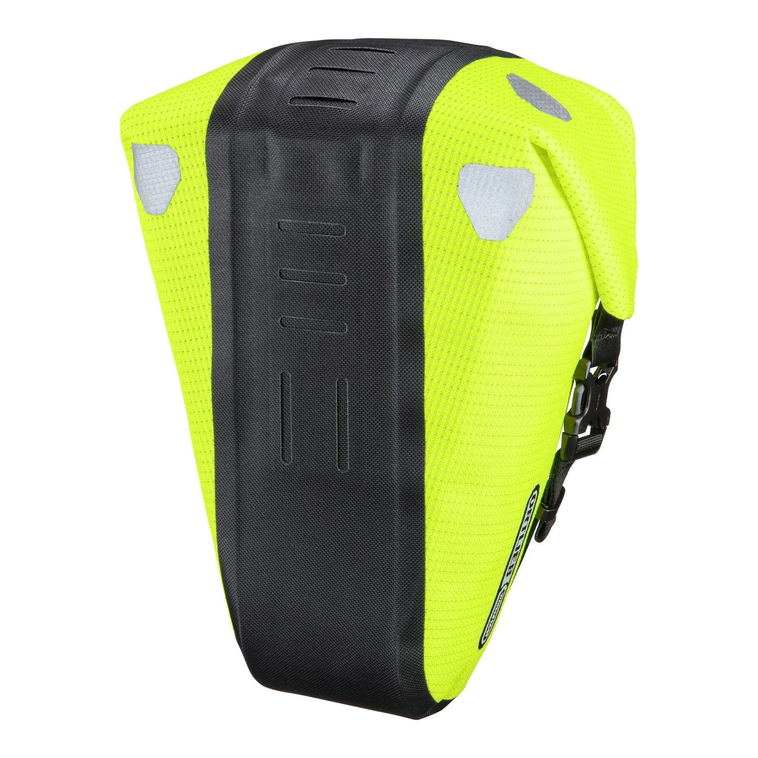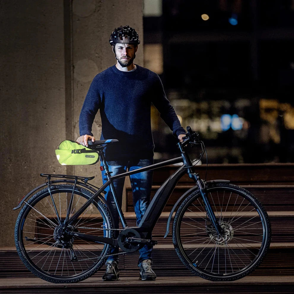 Sacoche sous-selle Ortlieb Saddle-Bag High-Vis à haute visibilité dans laquelle on peut vraiment emporter quelque chose ! Avec un système d'adaptation simple, pour une utilisation particulièrement facile et rapide. Un véritable classique ORTLIEB dans une nouvelle version revue : la Saddle-Bag High-Vis est fabriquée en tissu imperméable entièrement réfléchissant dans une combinaison attrayante jaune fluo-noir pour une meilleure visibilité. Avec un volume de 4,1 l, la sacoche de selle remplace un petit sac à dos. Idéale pour le cyclisme sportif sur route et en VTT, et pour tous ceux qui souhaitent voyager avec un minimum de bagages ; ou, comme sacoche supplémentaire pratique pour des tours plus longs avec beaucoup de bagages. Grâce à la fermeture à rouleau compressible et aux boucles latérales à enclenchement, le contenu voyage en toute sécurité et sans oscillations, mais reste toujours facilement accessible. La Saddle-Bag se fixe directement à la selle avec le système de fermeture à enclenchement réglable. L'adaptateur est particulièrement fluide et permet un montage et un démontage rapides. De plus, la fermeture à enclenchement est compatible avec le modèle précédent de la Saddle-Bag, elle peut donc être utilisée, par exemple, pour différents vélos. Une sangle en velcro sur la tige de selle garantit une plus grande stabilité et empêche l'oscillation indésirable d'avant en arrière. Un autre avantage : c'est un excellent garde-boue et remplace donc virtuellement le garde-boue arrière. Non adapté aux tiges de selle en carbone et aux selles en carbone !