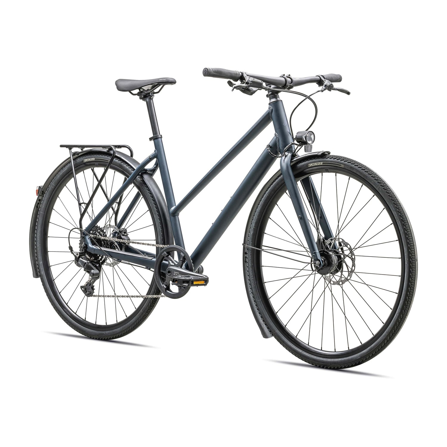 - Cadre : Specialized Aluminium Premium A1, géométrie Fitness, tubes à double paroi, passage de câbles interne, frein à disque flat-mount, serrage rapide, supports Plug + Play pour porte-bagages/garde-boue.