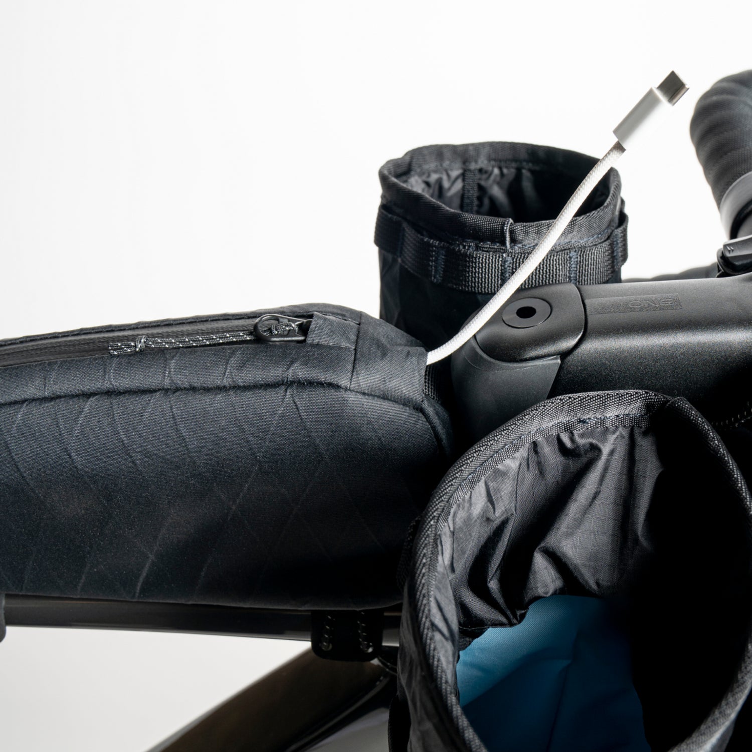 - La borsa da manubrio è realizzata in tessuto impermeabile. Cerniere e cuciture non sono impermeabili.