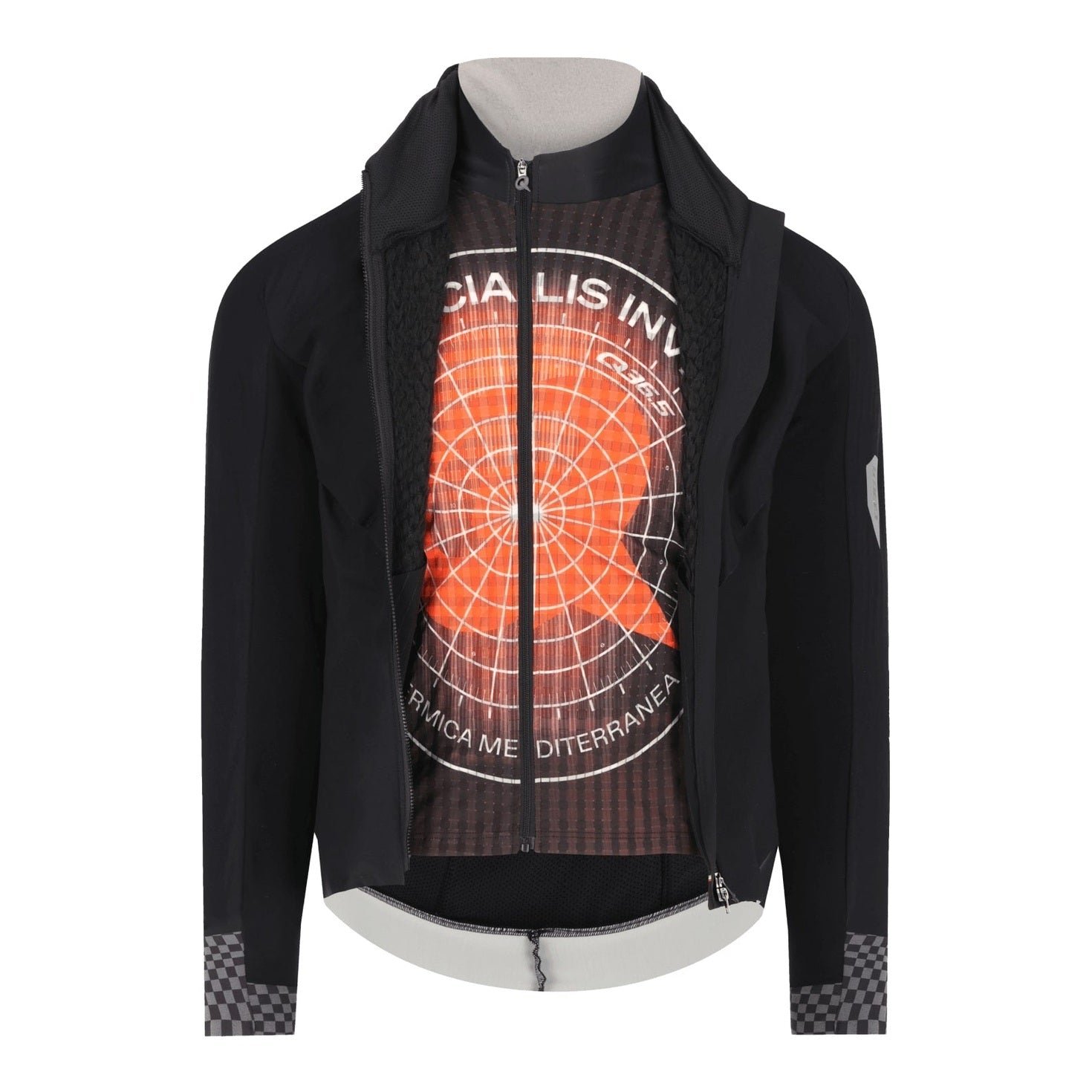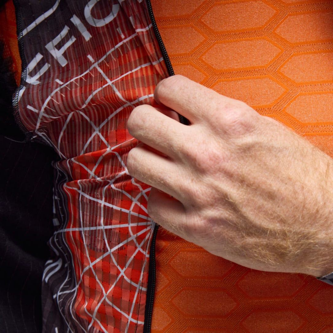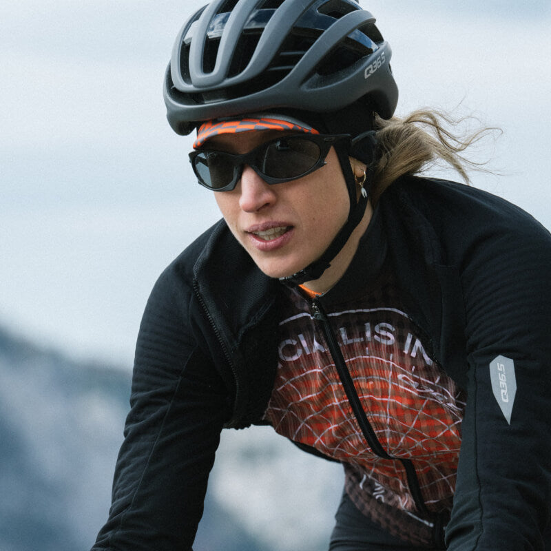 - Gilet integrato: All’interno della Mediterranea è presente uno strato aggiuntivo sotto forma di gilet ultraleggero realizzato con il nostro tessuto Clima arricchito da filato in grafene. L’utilizzo di un materiale così leggero e a rapida asciugatura offre una protezione minimale ma essenziale quando si pedala con la giacca aperta, ideale nelle lunghe salite o durante le sessioni più intense.