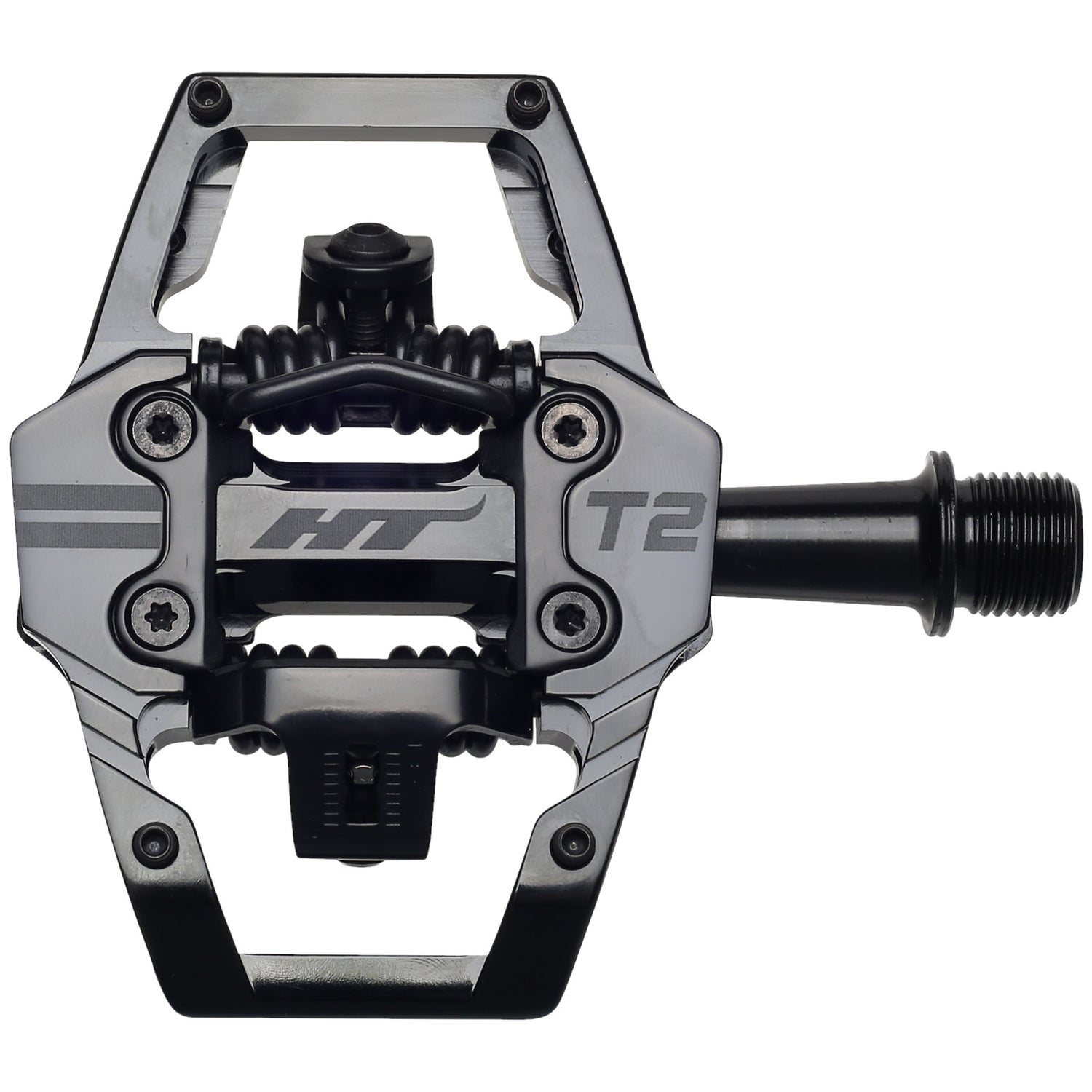 I pedali HT Enduro T2 hanno un corpo pedale in alluminio lavorato CNC e un asse in acciaio CrMo. Questo conferisce ai pedali un peso super leggero e una lunga durata. A ciò contribuiscono anche le guarnizioni di alta qualità e i cuscinetti IGUS. La piattaforma, con i suoi 4 perni e il collaudato sistema di tacchette HT, mantiene i piedi saldamente in posizione, anche su terreni pesanti. E se la situazione si fa difficile, si può sempre contare sull'affidabile meccanismo di sgancio.